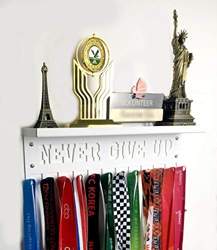 NEVER GIVE UP motiverande sportutmärkelser, medaljhållare, hylla, 3 tums troféhylla, medaljhängare, display med krokar, enkel installation, medaljställ och bandhängare vägghylla (vit)