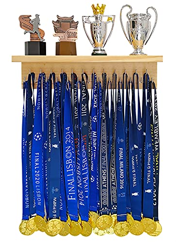 Qktxktzy Premium medaljhängare i trä med 40 cm troféhyllor organiserar medaljer, utmärkelser, band och troféer. Perfekt allt-i-1-hylla med 25 st stålkrokar. Väggmonterad medaljhållare för sportälskare