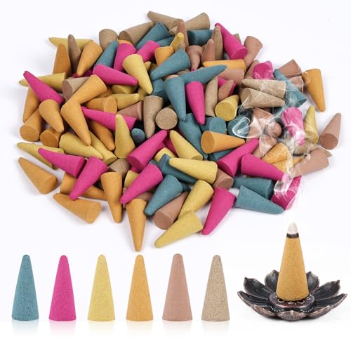 AUAUY Rökelsekoner, 120 st färska rökelsekoner med 1 hållare, 6 naturliga dofter inkluderar ros, jasmin, Osmanthus, hav, sandelträ, muggwort, perfekt för meditation, yoga, avslappning, heminredning