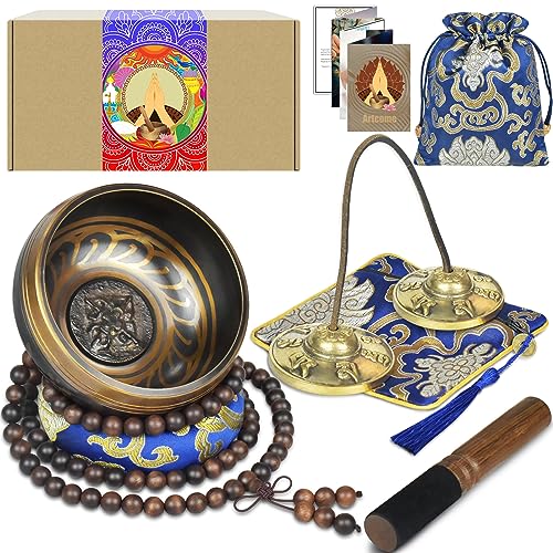 Artcome Tibetanskt meditationsset – ljudskål och tingsha-bassäng, handgjord i Nepal, för meditation, yoga, lugn, avslappning, chakraläkning, stress och mindfulness