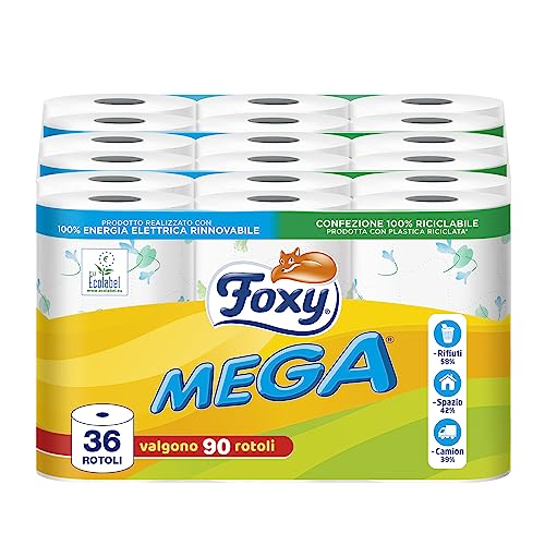Foxy mega | Toalettpapper 36 rullar | 480 slitsar | Dekorerad | 100% förnybar el | Förpackning tillverkad av återvunnen plast
