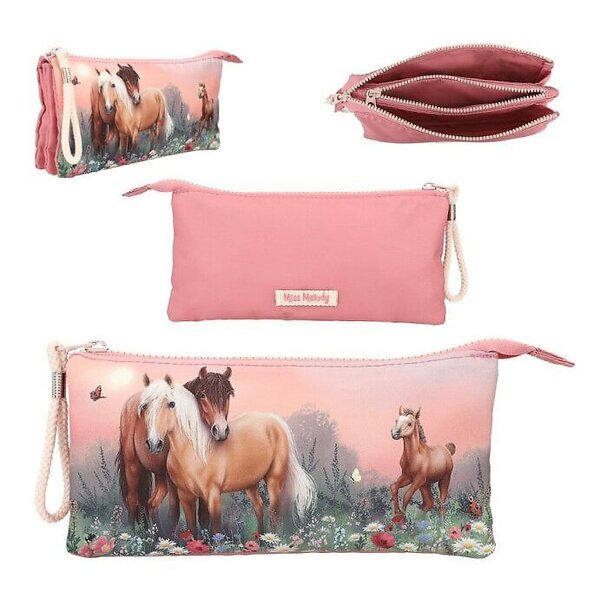 Depesche 13403 Miss Melody romantiska fält fyllt 3-fack pennfodral i grönt, med hästmotiv, blommor och glitter, pennfodral med färgpennor, linjal, sax och mycket mer