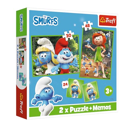 Trefl - Smurfarna, Smurfarnas glada spel - 3i1: 2x Pussel + Memory-spel, 30 och 48 bitar, Olika svårighetsgrader, 24 memokort, Lek för barn över 3 år
