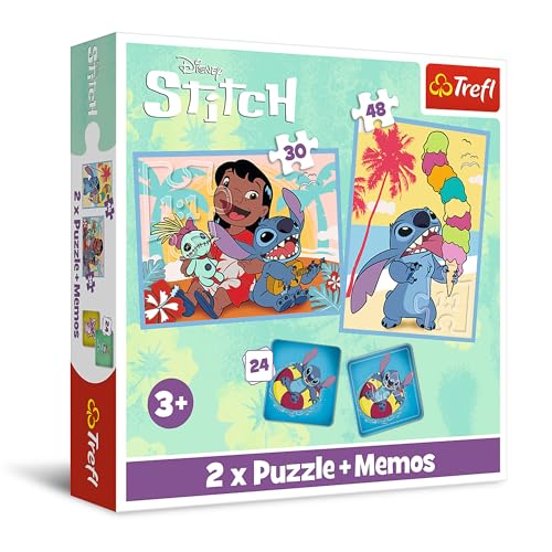 Trefl - Lilo & Stitch, Lilo&Stitchs glada dag - 3i1: 2x Pussel + Memory-spel, Pussel med sagans karaktärer, 30 och 48 bitar, Olika svårighetsgrad, 24 memokort, Lek för barn från 3 år