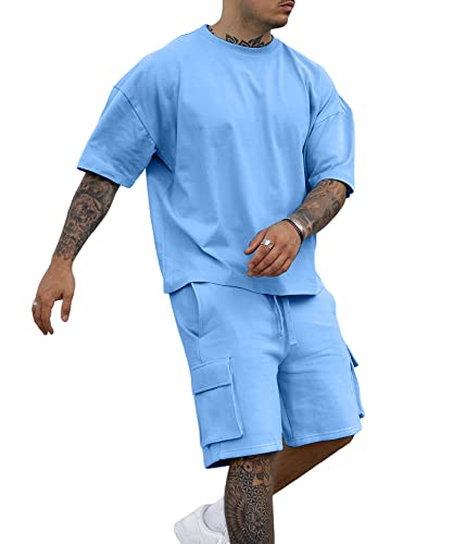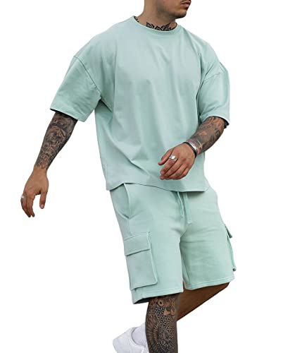 YawYews Men's 2 Piece Outfits Casual Tracksuit Cargo Shorts Summer Athletic Drop Shoulder Sleeve Sportwear Set