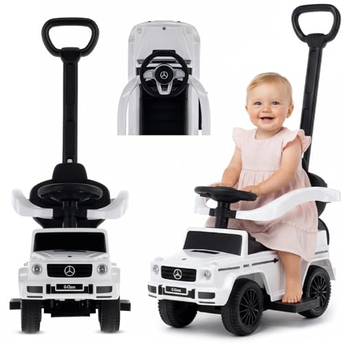 Barnbil från 1 år med tryckstång, Mercedes G Bobbycar, bil för barn, babybil (Vit)