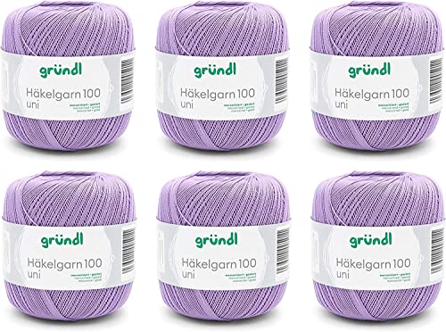 Gründl Häkelgarn 100 Uni (virkad ull, stickgarn, merceriserat bomullsgarn för virkning tillverkad av 100% bomull, 100 g/566 m, nålstorlek: 1,5-2 mm, 6 x 100 g), lila