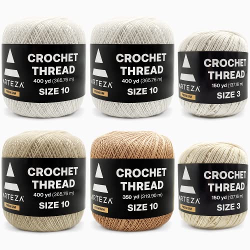 Arteza virkad tråd set – 6-pack 100% bomullsgarn för virkning, merceriserat – storlek 25 cm vit, beige och naturlig – storlek 7,6 cm vit och naturlig – mjuk och färgglad stickning och