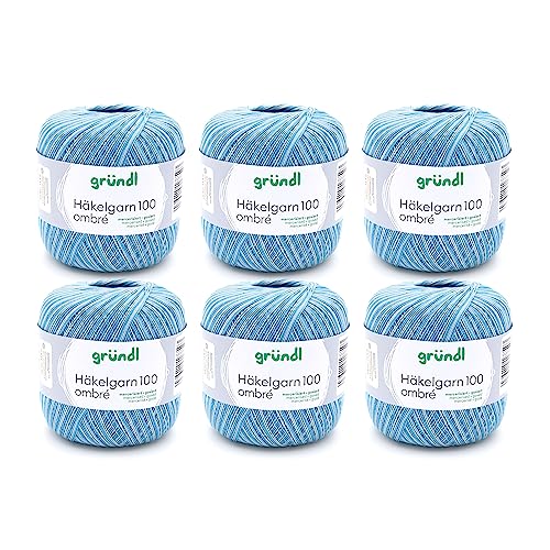 Gründl virkgarn 100 ombré (merceriserat bomullsgarn för virkning tillverkat av 100% bomull, 100 g/566 m, nåltjocklek: 1,5 – 2, 6 x 100 g), hav