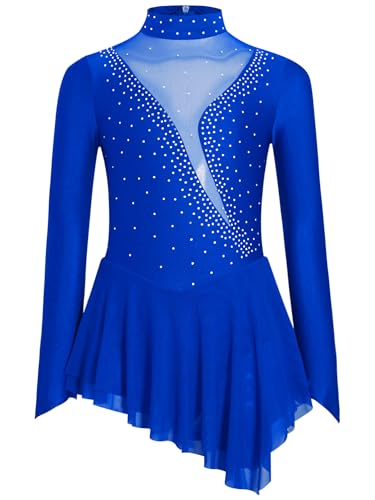 CHICTRY Konståkningsklänning damer glitter långärmad balettklänning med strass ståkrage danskropp mesh lapptäcke tröja asymmetrisk omlottkjol danskläder, blå, 170