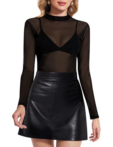 Kiiwah Dam Transparent T-shirt Långärmad Blusar Mesh Stilig Svart Tröja Mesh Toppar Sexig Tunika Blusar Clubwear Tulle T-Shirt, Matt svart, L