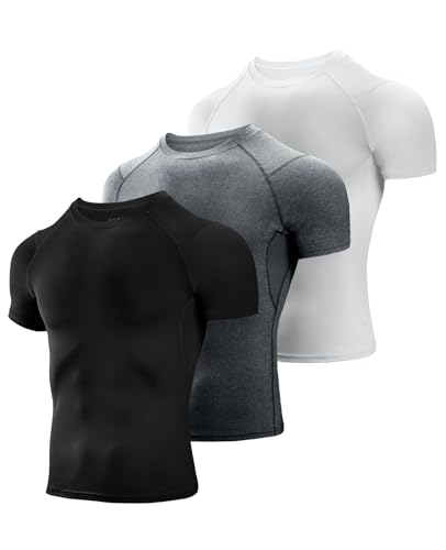 Niksa 1/3 stycken kompressionströja herr, löpartröja herr, kortärmad med underarm mesh, kortärmad funktionell tröja, andas, sportskjorta för löpning, träning, jogging, fitness, gym, Svart/grå/vit, 3