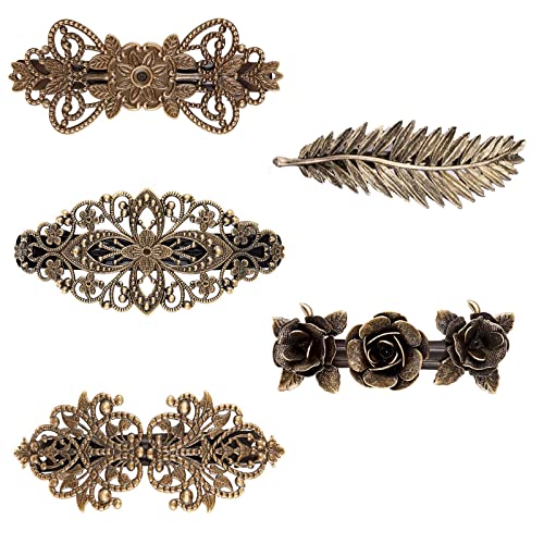 5 st franska vintage hårspännen, retro vintage fransk hårspänne i metall, metall brons hårklämmor, ros, blomvåg fjäder, krona, för kvinnor eller flickor gåva