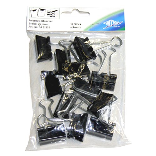 Wedo 6421525 Foldback klämmor, 12 stycken i påsen, lackerad metall avtagbar bygel, stark fjäder, 25 mm, svart/silver