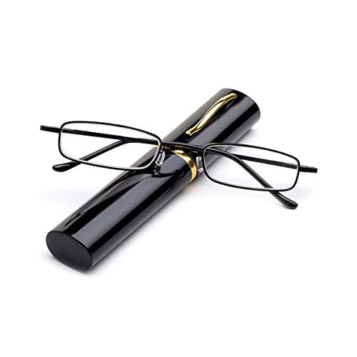 Läsglasögon av metall, flexibla glasögon, synhjälp, med fjäder och gångjärn, läshjälp, unisex, inklusive glasögonfodral med klämma (svarta, +2,0)