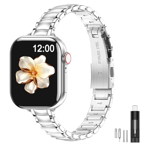 MioHHR smalt metallband kompatibelt med Apple Watch Band 42 mm (serie 11/10) 41 mm 40 mm 38 mm, uppklädt rostfritt stål kedjerem för kvinnor iWatch band serie 9 8 7 6 5 4 3 2 1 SE3 SE2 SE, silver