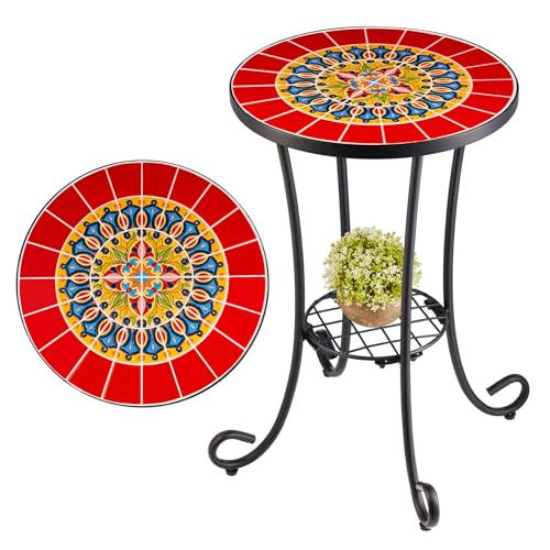 VONLUCE Mosaik, sidobord, runt retro, mosaikbord, metallbord, kaffebord, 35,5 x 54,5 cm, blompall, blomställ, växtstativ, blomhylla med mosaikplatta, 30 cm (röd)
