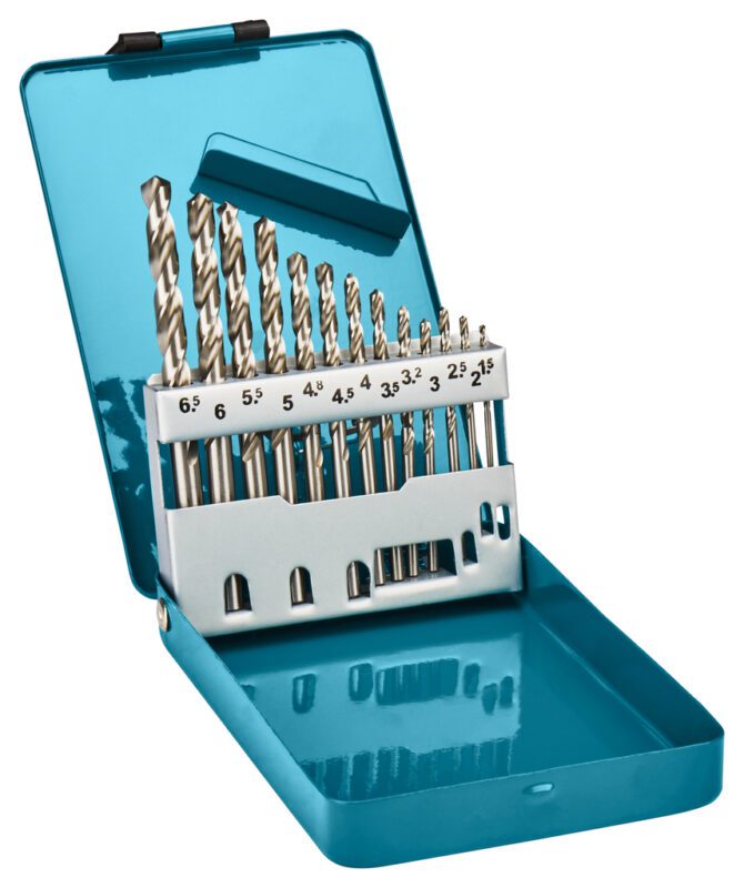 S&R Metallborrset 1,5-6,5 mm, 13 delar, HSS-G COBALT, DIN 338, koboltlegerat, industriell kvalitet, C-slipning enligt DIN 1412, 135°, slipade, metallbox, spiralborr, stålborrset.