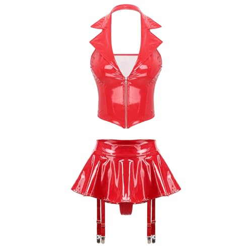 iiniim Wetlook damunderkläder set metallic crop toppar minikjol veckad kjol med strumphållare sexiga underkläder nattkläder GOGO fest klubbkläder, röd, L