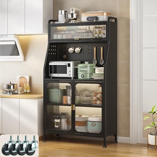 Fiutazge 160cm Köksskåp, metallskåp med hjul och justerbara fötter, högskåp kök med justerbara hyllor, köksvitrinskåp, köksskåp med bänkskiva, svart 76 x 36 x 160 cm
