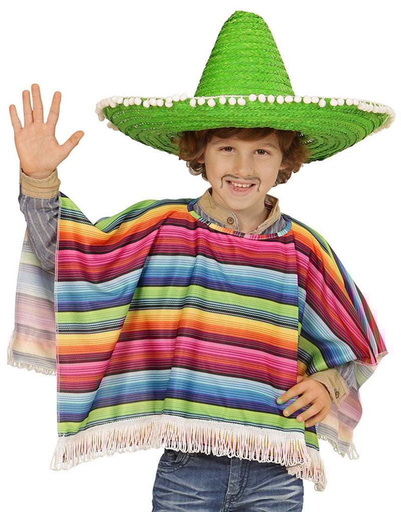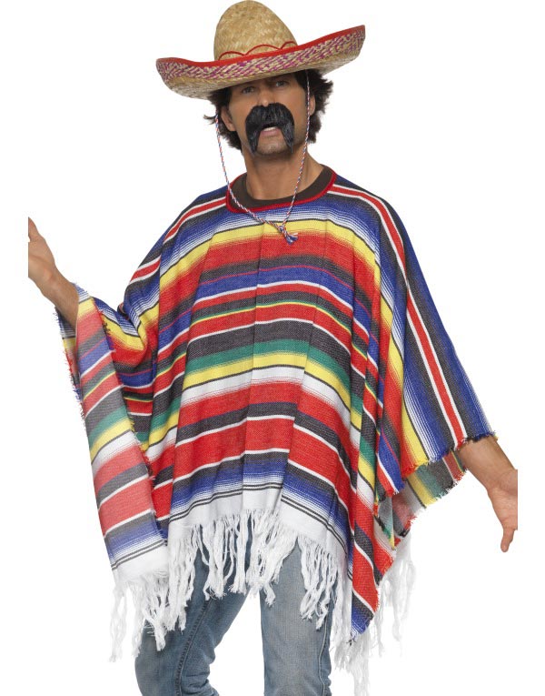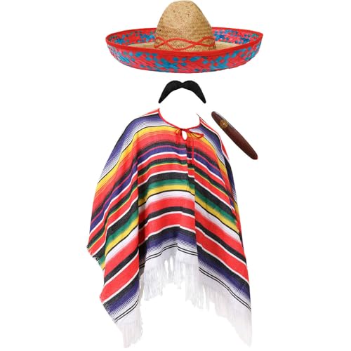 Mexikansk kostym för vuxna – flerfärgad poncho, röd halm sombrero, falsk cigarr, falsk mustasch – herr damer Mexico Cinco de Mayo maskeraddräkt