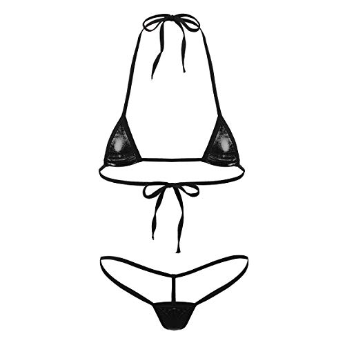Women's Sexy Micro Thong Bikini Bottom Padded Top Triangle Bikini Bathing Suit(S, Black)