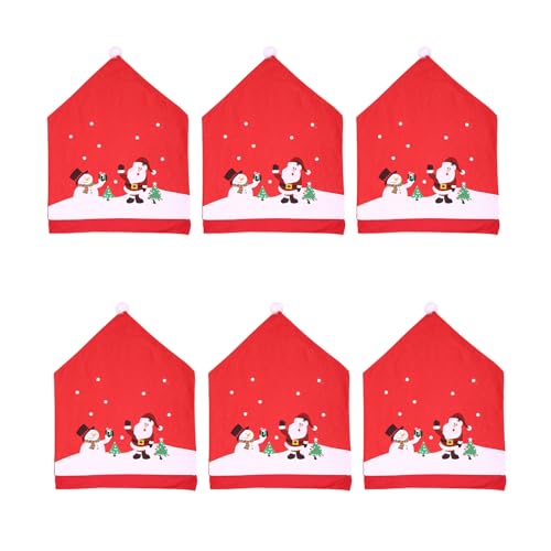 Jul Röda Stolsöverdrag Set, Hattformad Tecknad Tomte och Snögubbe Parttern överdrag, för Jul Restaurang Middagsbord Julfest Dekoration (6 Pcs)