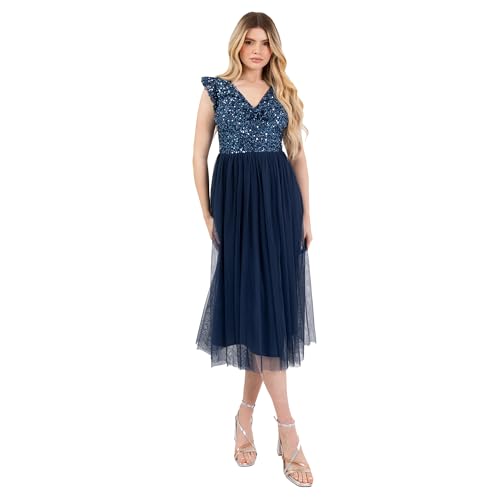 Maya Deluxe Dam midiklänning dam V-ringad fladdrande ärm paljett förskönad framsida tyll bröllop gäst brudtärna tillfälle dam, marinblå, 50