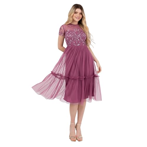 Maya Deluxe Midiklänning för kvinnor, paljett embellished kortärmad ruffle för bröllop, gäst, bridesmaid, evenemang, bal, vine, 54, vin, 54 SE