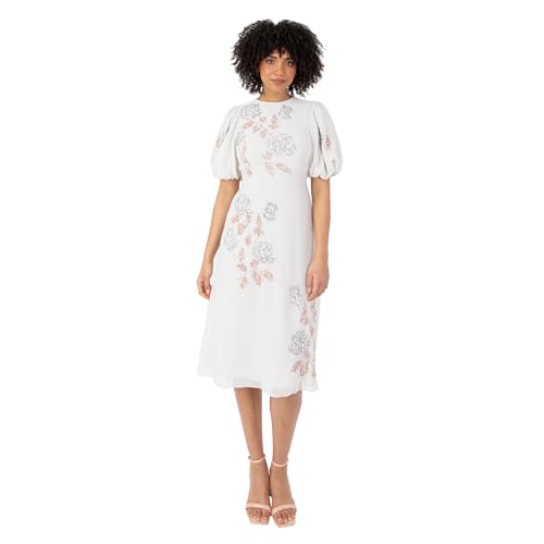 Maya Deluxe midi-klänning för kvinnor rund hals kort puffärm paljett utsmyckat blommigt nyckelhål baksida A-linje bröllop gäst grå 14, Grå, 40 SE