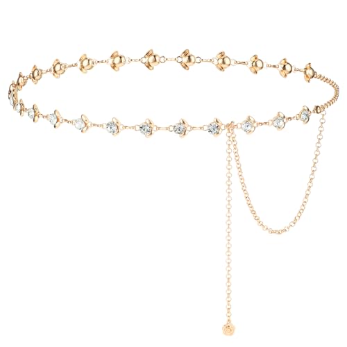TIESOME Kedjebälte för kvinnor, strassblomma midjekedja, justerbara kristall-midjebälten brud bröllopsbälte för klänning, Guld, One Size