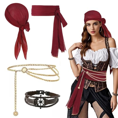 TUONYIS 4 st piratkostym tillbehörsset, medeltida kvinnor, pirat, maskeradtillbehör, piratbandana och skärp, armband, midjekedja, för halloween, piratfest, cosplay, karneval (röd)