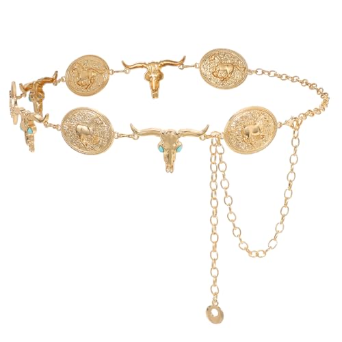 WHIPPY Dam Western metall concho-bälte, vintage boho guld kedjebälte för kvinnor klänningar jeans justerbar cowgirl midjekedja land konsert outfit, Guld (tjurhuvud), Fit waist size below 36"