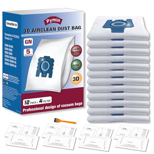 Pymin 12-pack GN dammsugarpåsar kompatibla med Miele Hoover väskor, 3D effektivitet GN dammsugarpåsar för klassisk C1, komplett C2 C3, S227 S240, S270, S400, S600, S800, S2, S5, S8-serien (12 påsar +