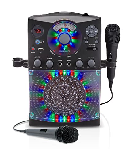 Karaoke system med Bluetooth-anslutning – sångmaskin SML385U i svart för Europa – LED-ljuseffekter, mikrofon, USB, RCA-uttag, eko och balanskontroll och AUX-ingång.