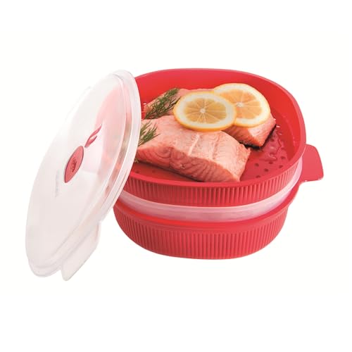 Snips - 4L röd mikrovågsugn ångkokare med 2 överlappande brickor för dubbel ångkokning, matbehållare - behållare för mikrovågsugn, 26,5 x 22 x 13,5 cm, tillverkad i Italien