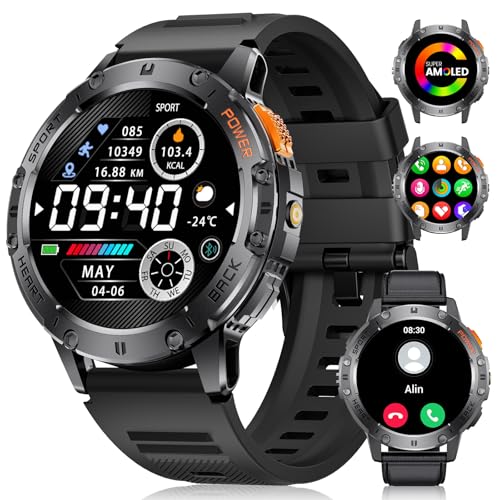 1,43” AMOLED Smart Watch Militär Men med Telefonsamtal, Talassistent, 3 Armband, Rund HD-skärm Smart klocka, Sömnspårare Pulsmätare, 123 Sportlägen, Fitness tracker Smartwatch för Android iOS (Svart)