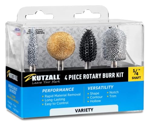 Kutzall 4-Piece Rotary Burr Kit - 1⁄4" Shaft, Variety Grit - Woodworking Attachment for Bosch, DeWalt, Makita, Milwaukee Tools - Structured Tungsten Carbide