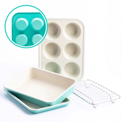 GreenLife Bakeware Hälsosam keramisk nonstick brödrost ugn mini 4 delar bakset, inkluderar 6-kopp muffinsform, rektangulär kakform, bakplåt och kylställ, PFAS-fri, ugnssäker upp till 230°C, turkos