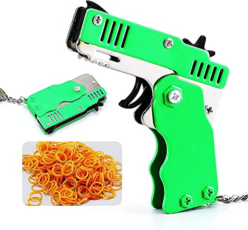 Mini-gummibandspistol av metall, hopfällbar, 6 skott med nyckelring och 60+ gummiband, liten vikbar gummibandspistol av metall, för skjutspel, utomhusaktiviteter för barn (grön)