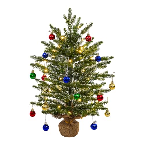 Uten 2 fot/60 cm konstgjord mini-julgran, PE bord liten julgran med 50 LED-ljusslingor, 18 dekorativa bollar, säckvävsbas för kontor matbord fönsterbräda jul skrivbordsdekoration