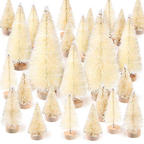 60 stycken konstgjord mini julgran sisal snö träd flaska borste julgranar dekorationer med träbas för julfest heminredning (4 storlekar, vit)