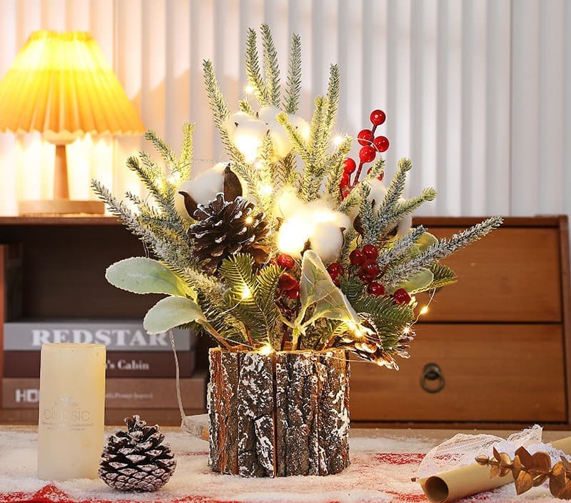 60 cm/2 fot mini julgran av konstgjort bord, 60 spetsar, med snöflingedekoration, 3 typer av tallblad, linnebas, bomull och cement för juldekorationer