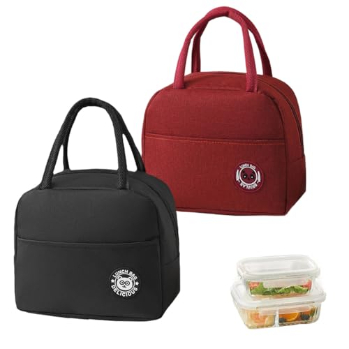 2 stycken lunchväskor, 6 l termoväska för mat liten, lunchlådeväska med aluminiumfolie, bärbar kylväska vikbar liten, mini kylväska för skola, picknick, hem, resor (vinrött+svart)