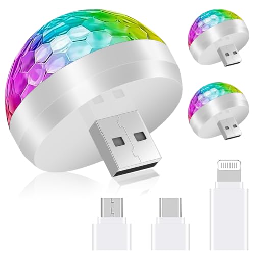 URAQT Mini Disco Lights, 3 st Vit USB Ball Light, 4 färger Bärbar Strobe Light med 9 adaptrar, LED Car Atmosphere Light för julfester DJ Car Interiör