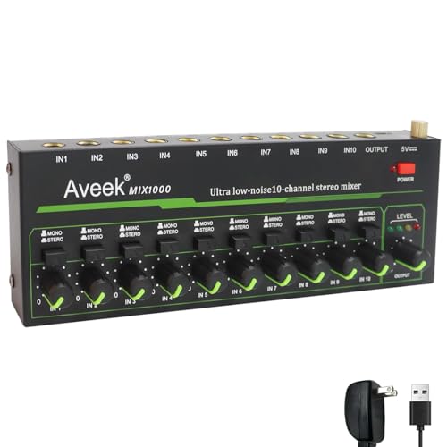 Aveek Mini Line Audio Mixer – 10 kanals liten ljudmixer med stereo/mono-växling och lågbrusdrift för precisionsdelblandning, 1/4 tum TRS-ingång/utgång idealisk för mikrofoner/gitarrer/bas/scen