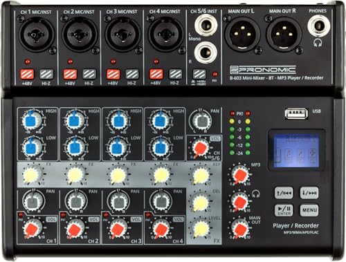 Pronomic B-603 Mini-Bluetooth USB-mixer - kompakt mixer med 6 kanaler, 4 Combo, Alim Phantom, Hi-Z-strömbrytare, USB-port, XLR-utgångar, svart.