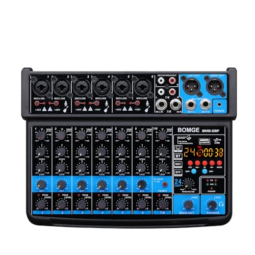 BOMGE 8 kanaler mini ljudmixer Line Mixer, DC 5V, med MP3-spelare, Bluetooth, U disk 48V, 24DSP effekter, USB-inspelning Idealisk för små klubbar eller barer, studioinspelning (8 kanaler-BLACK)
