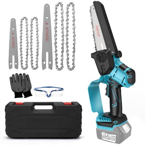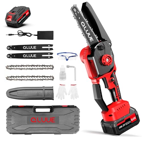Mini motorsåg batteridriven, QLUUE bärbar motorsåg 6/8 tum, med 1150 W motor, säkerhetslås och flera tillbehör, erbjudande för trädgårdsarbete, grenskärning, träskärning (6 tum 1 batteri)