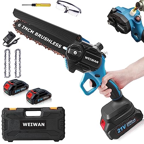 WEIWAN Mini batteridriven motorsåg för beskärning med 2 batterier oljepump, 6 tum bärbar batteridriven elektrisk motorsåg för beskärning av trädgårdar, 2 x batterier 2 Ah, borstlös motor, 3 kedjor